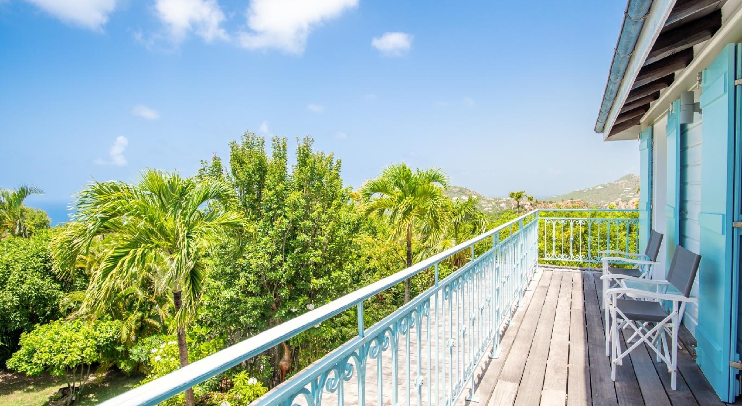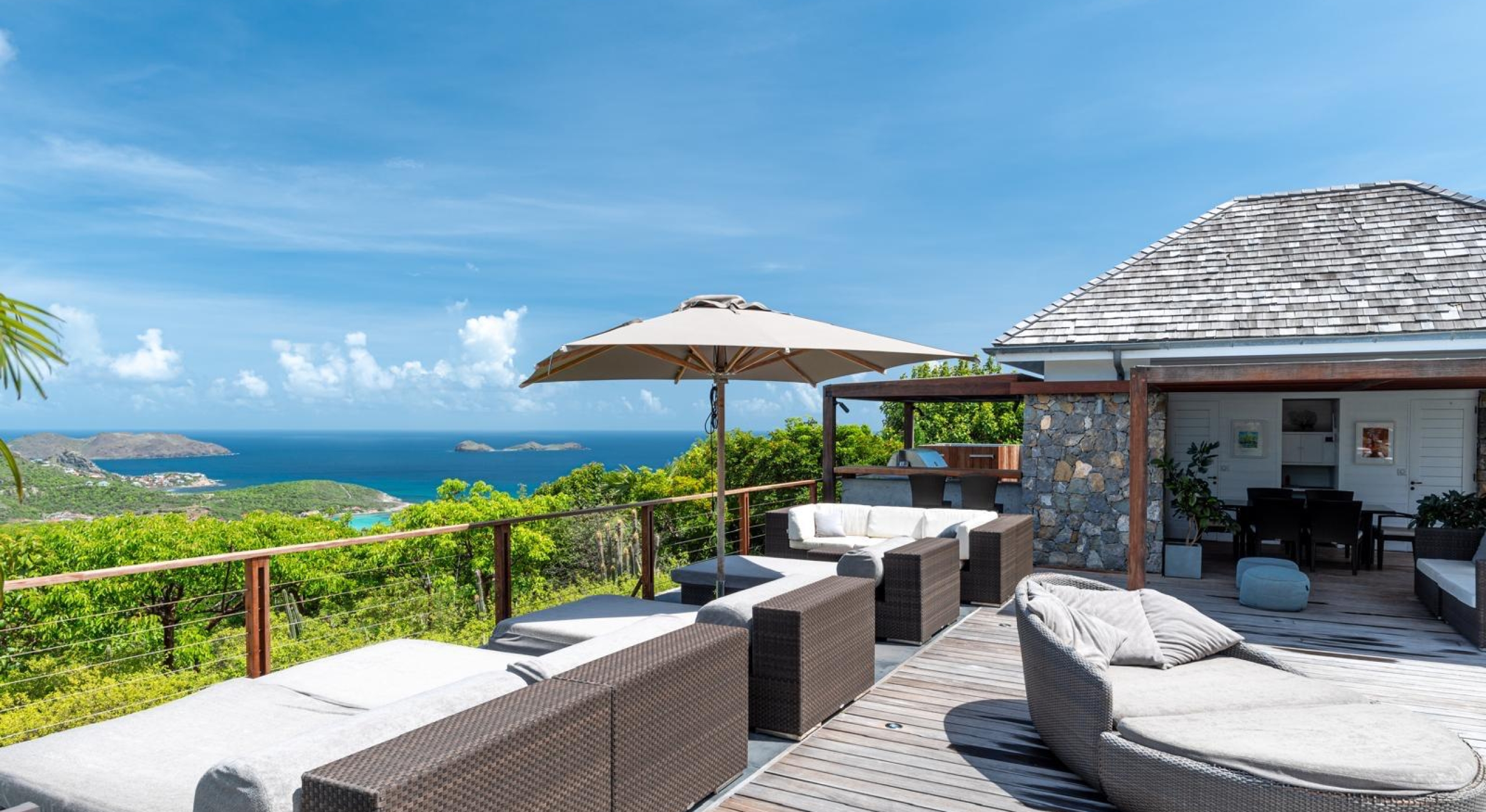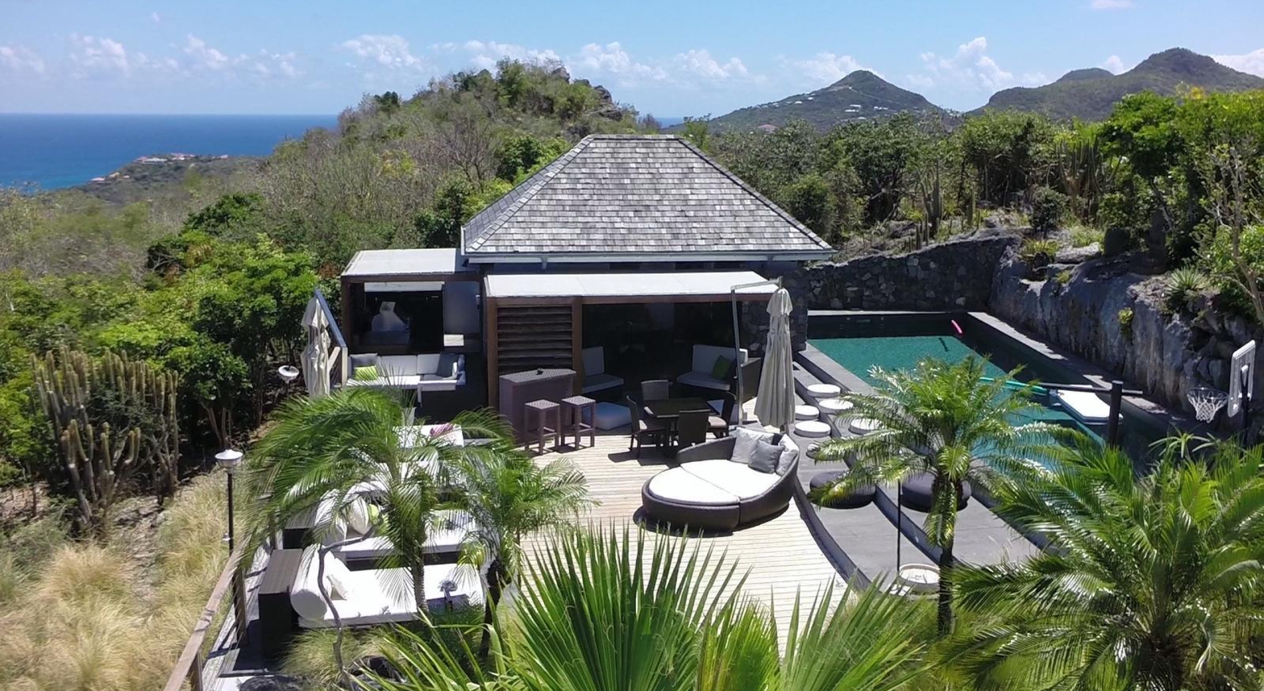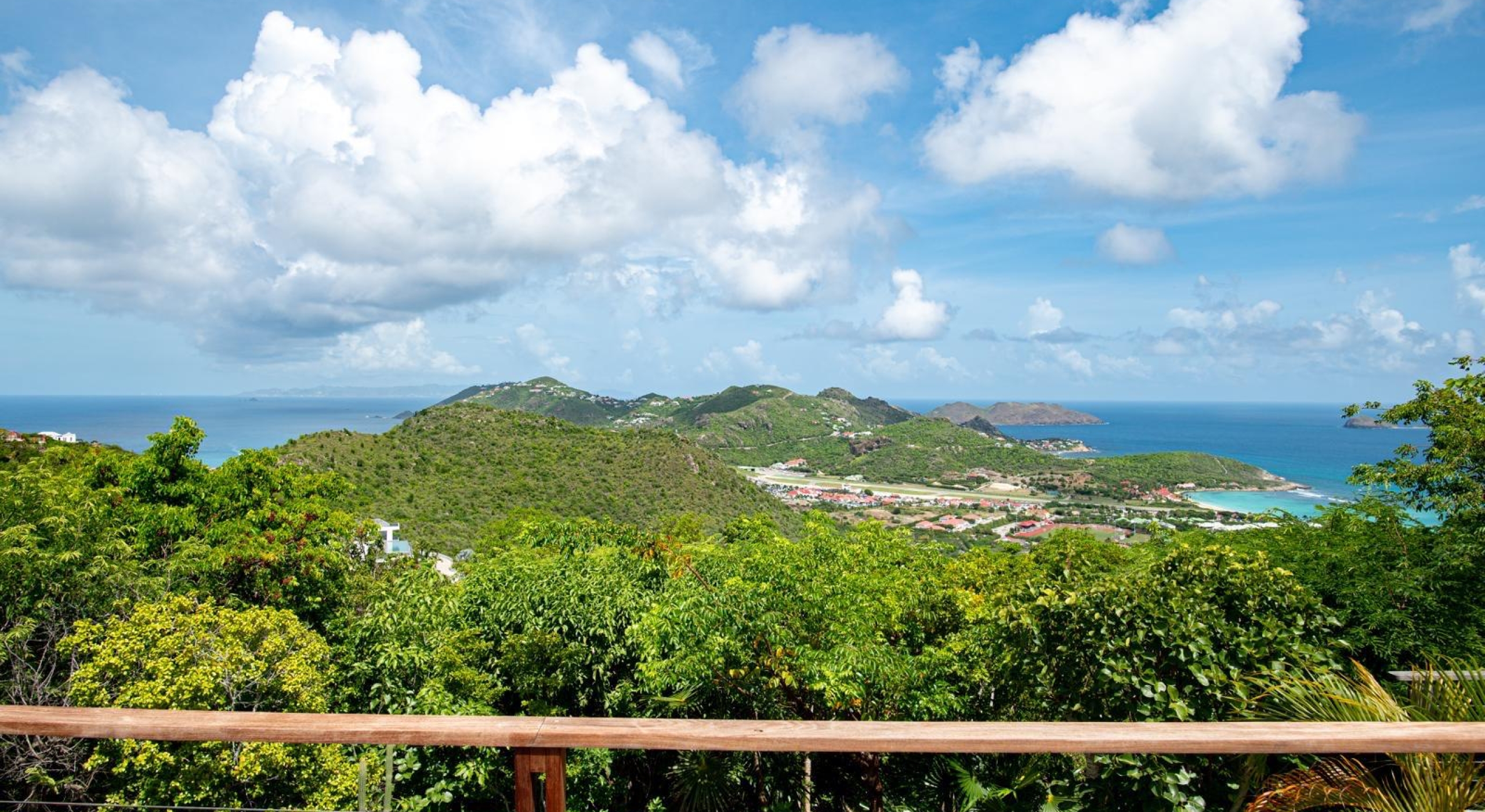 The property overhangs a part of St Barts, the hills and the islands far off. It offers a very nice diversified view.