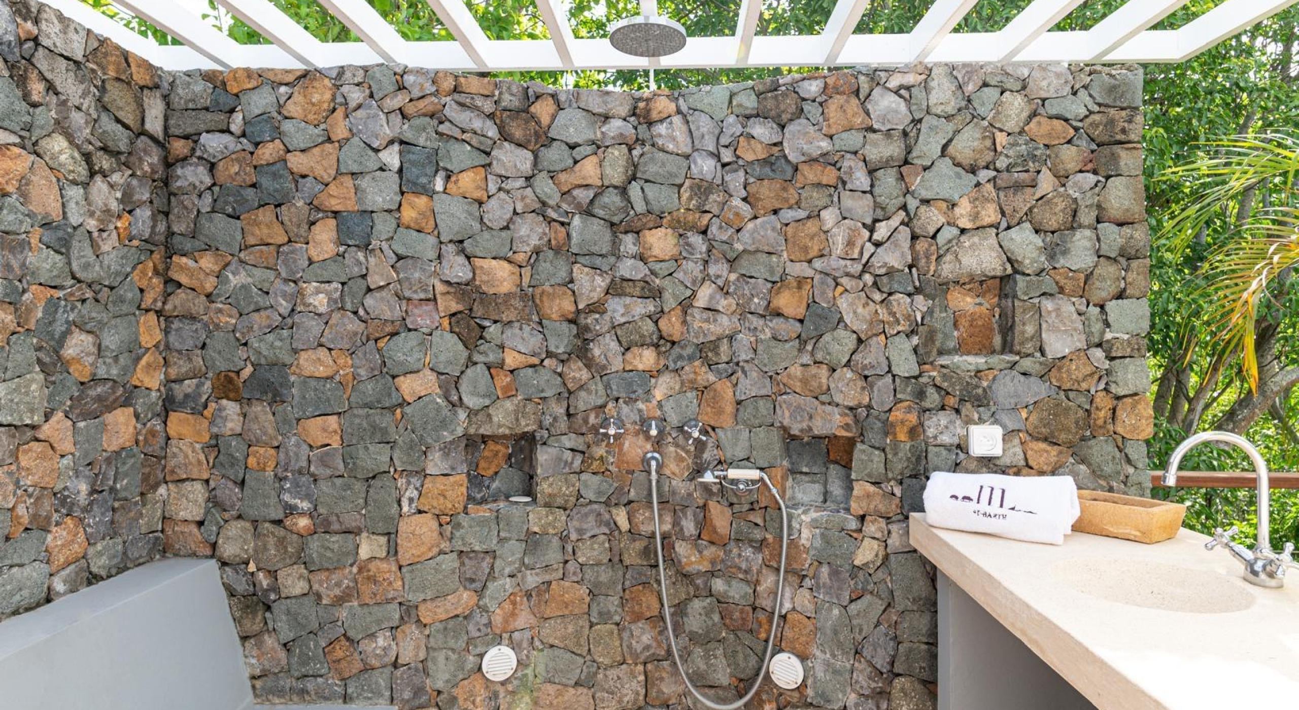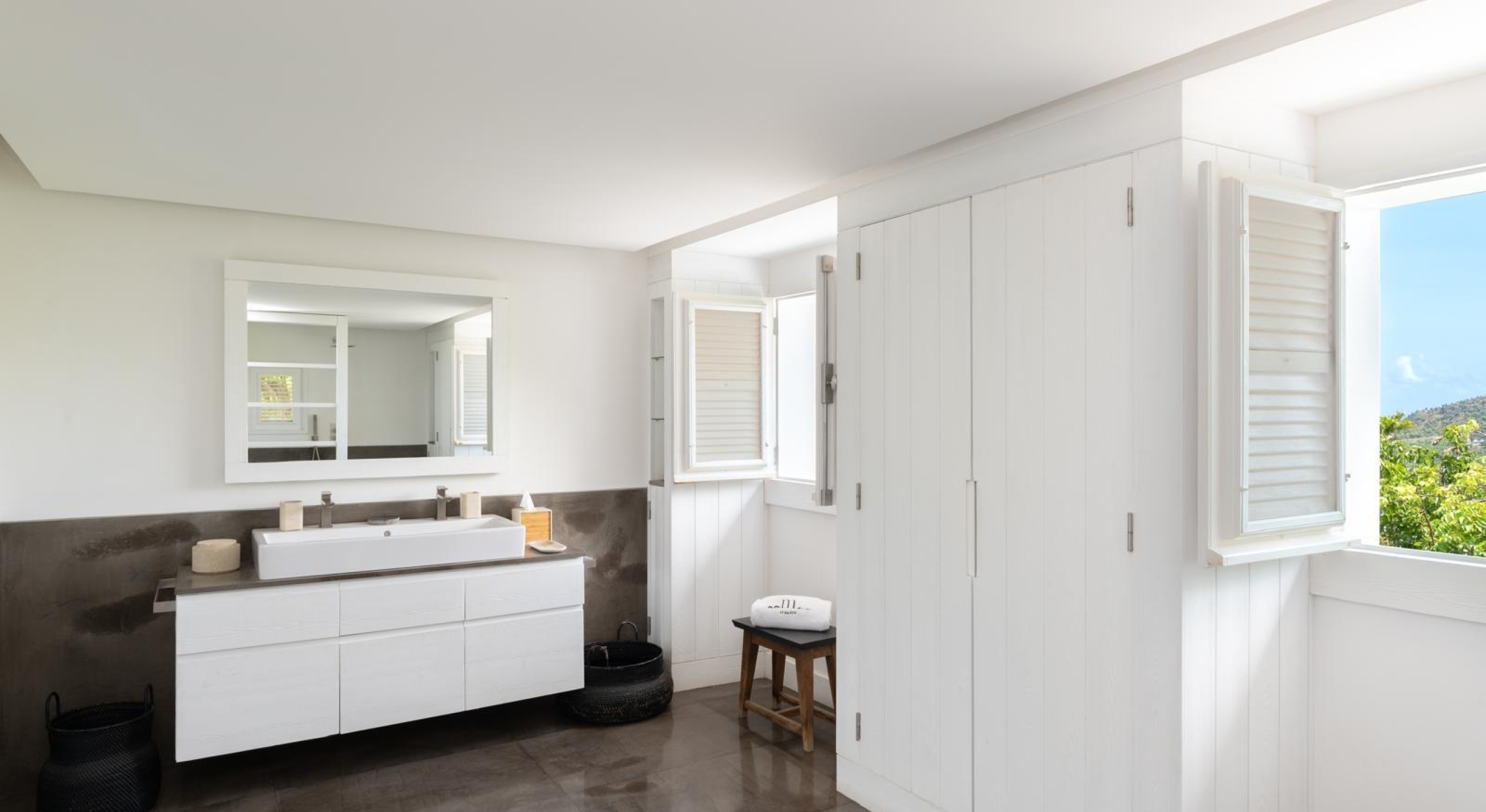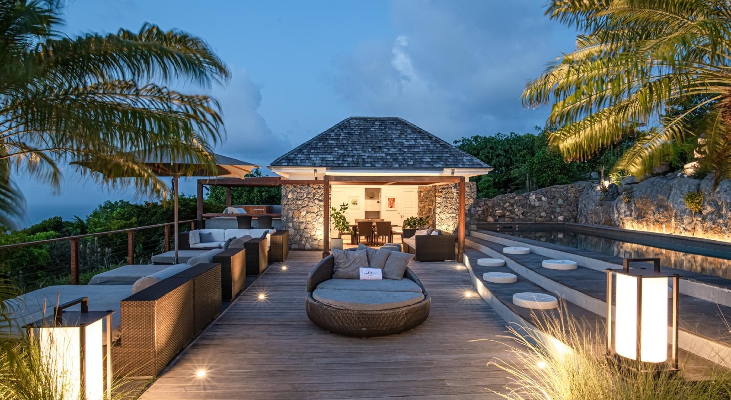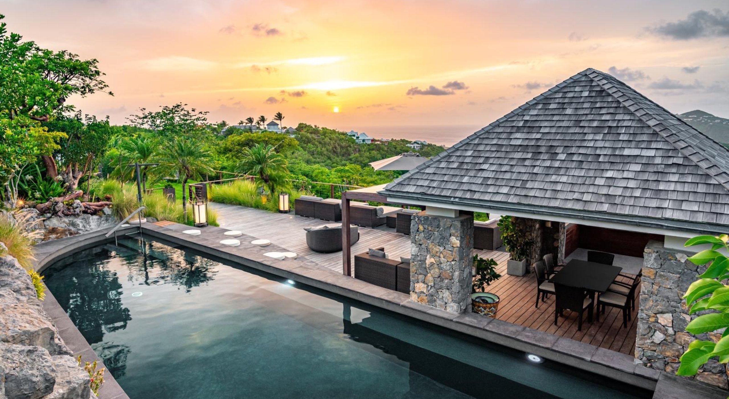 The property overhangs a part of St Barts, the hills and the islands far off. It offers a very nice diversified view.