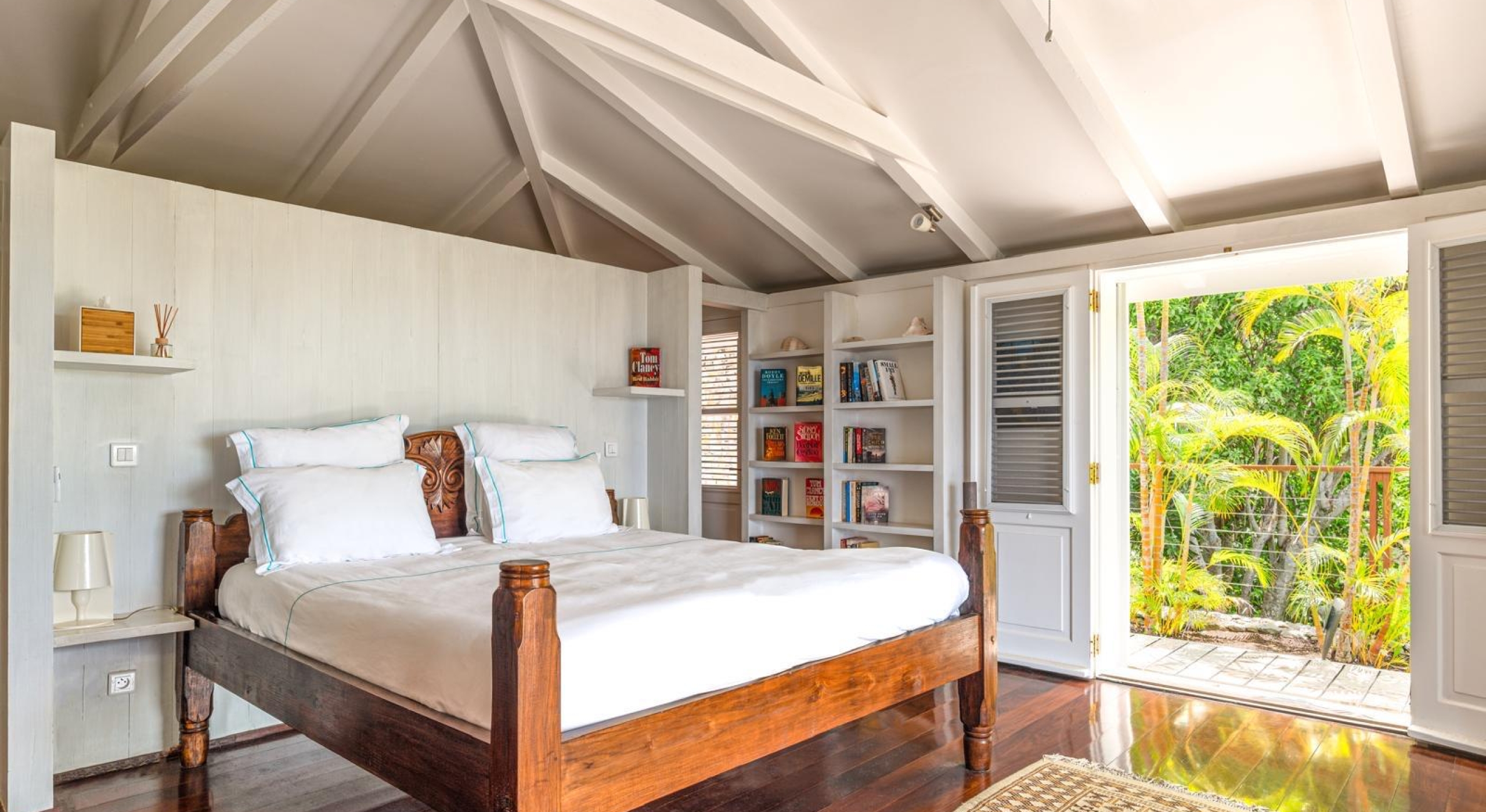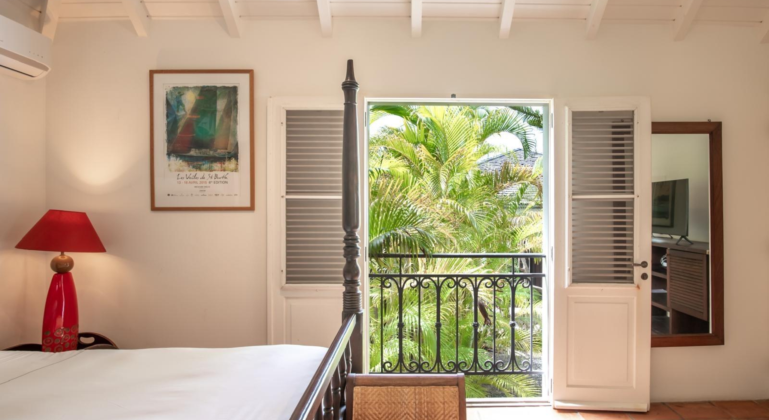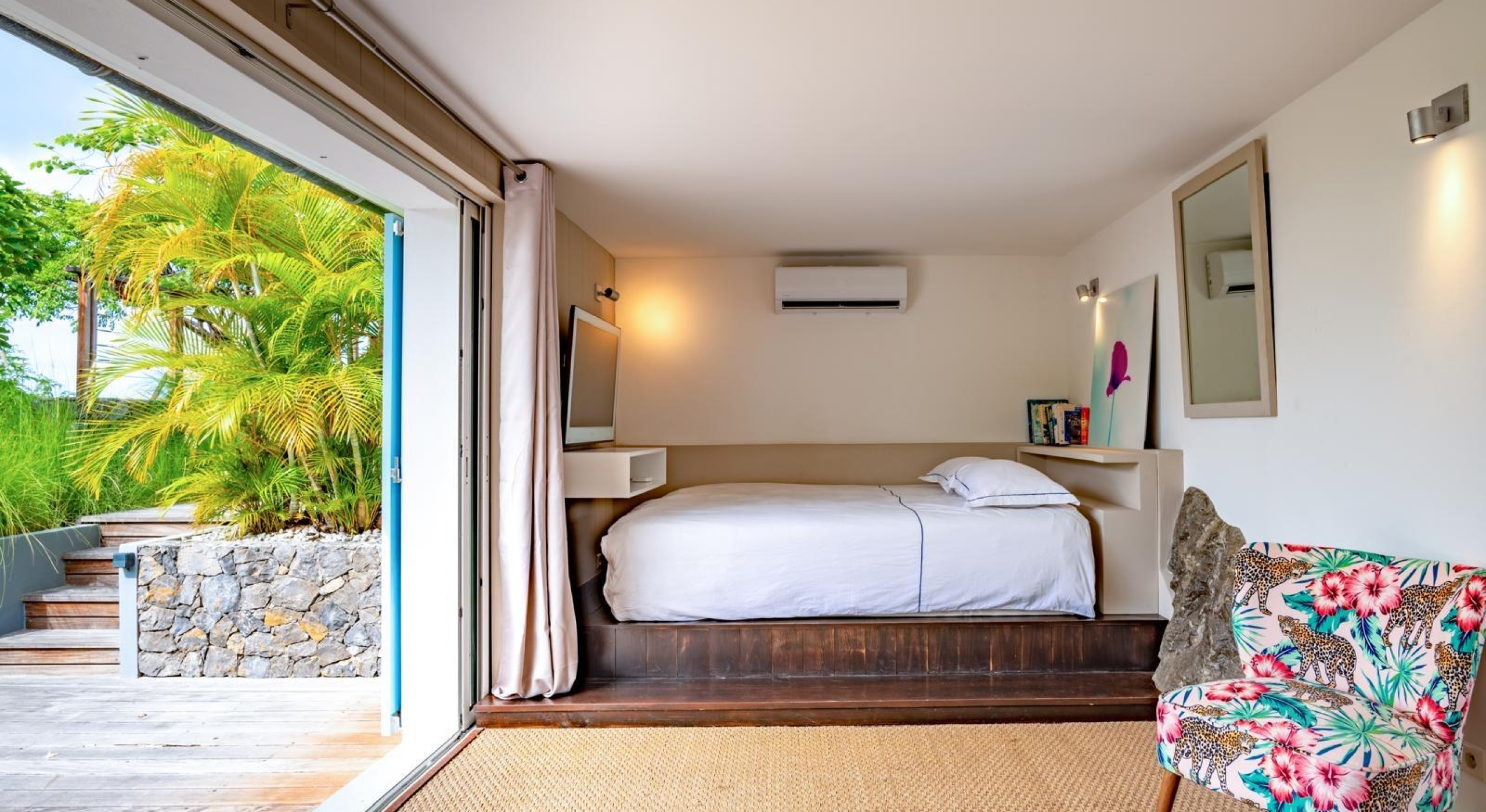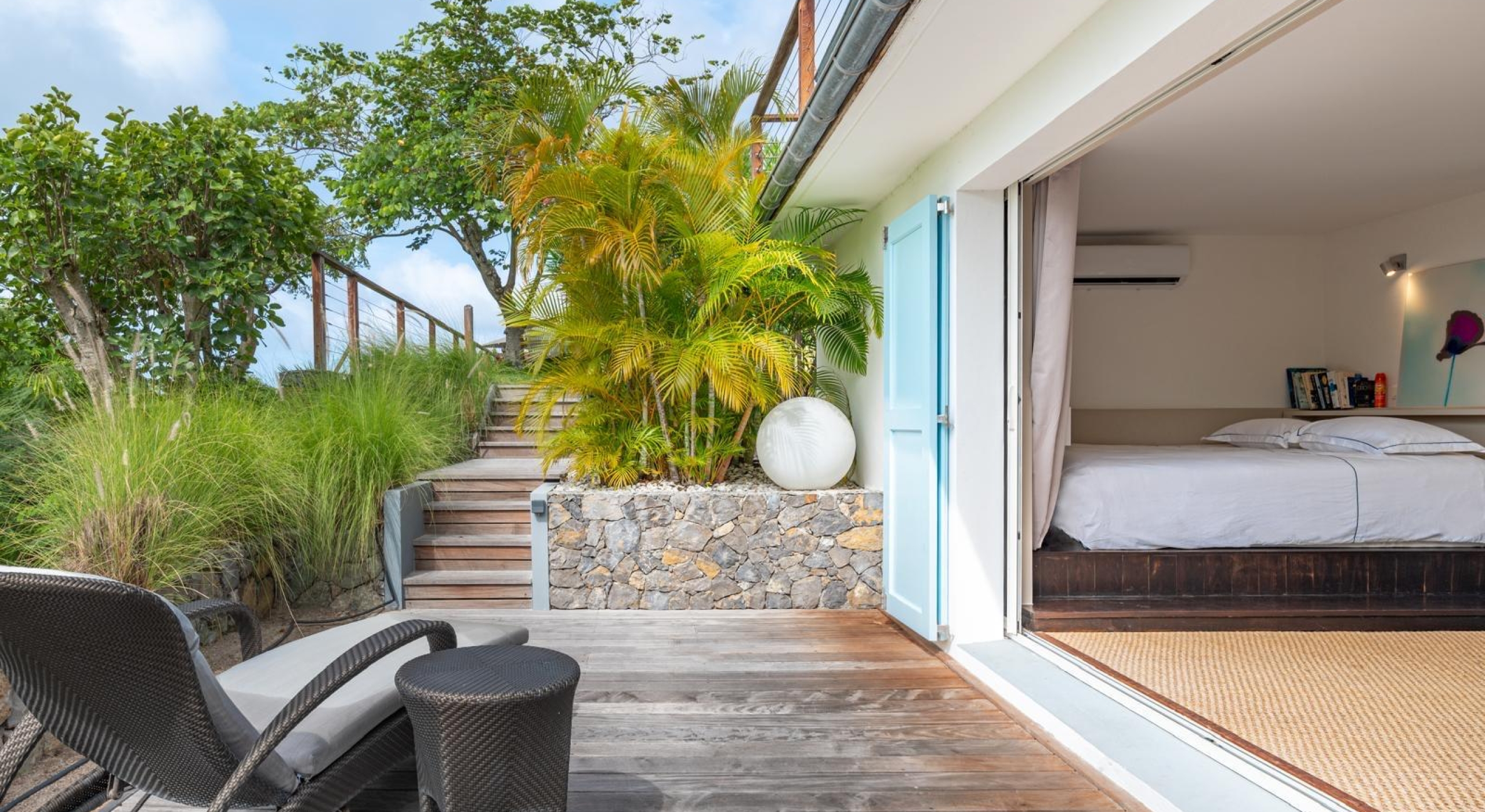 From the living you access the master bedroom on the first floor. Spacious, it opens onto a balcony overlooking the tropical garden and the ocean.