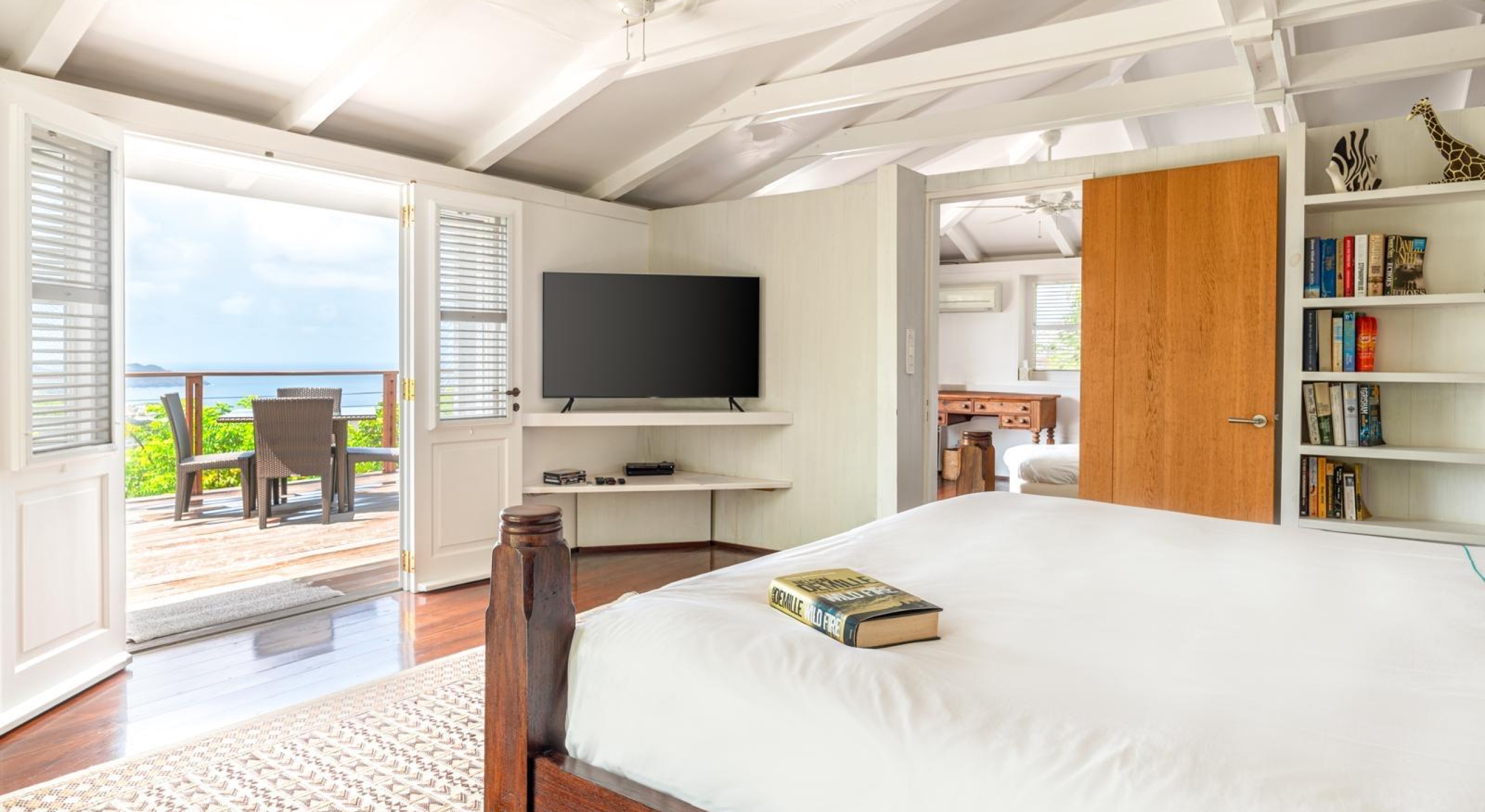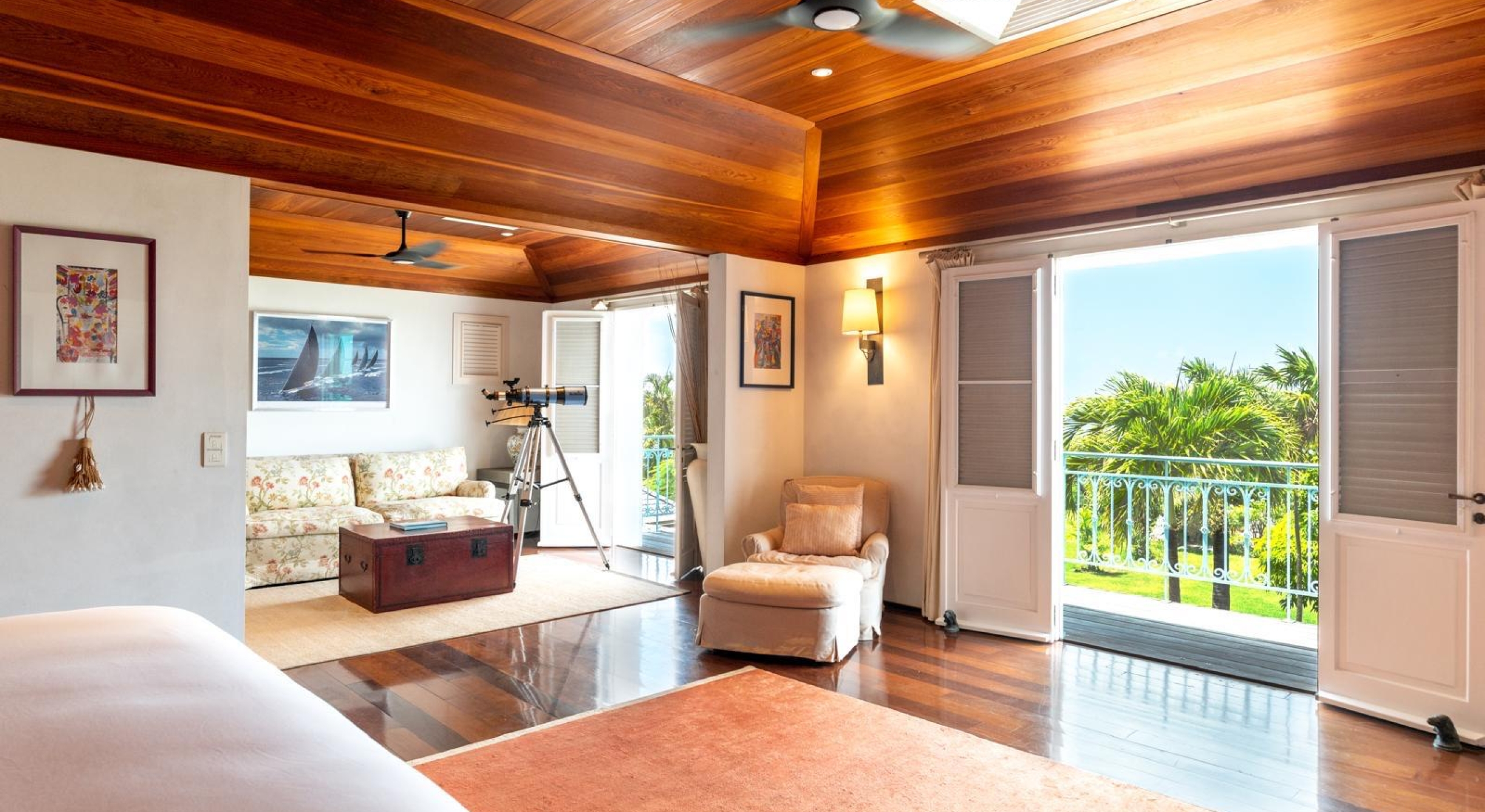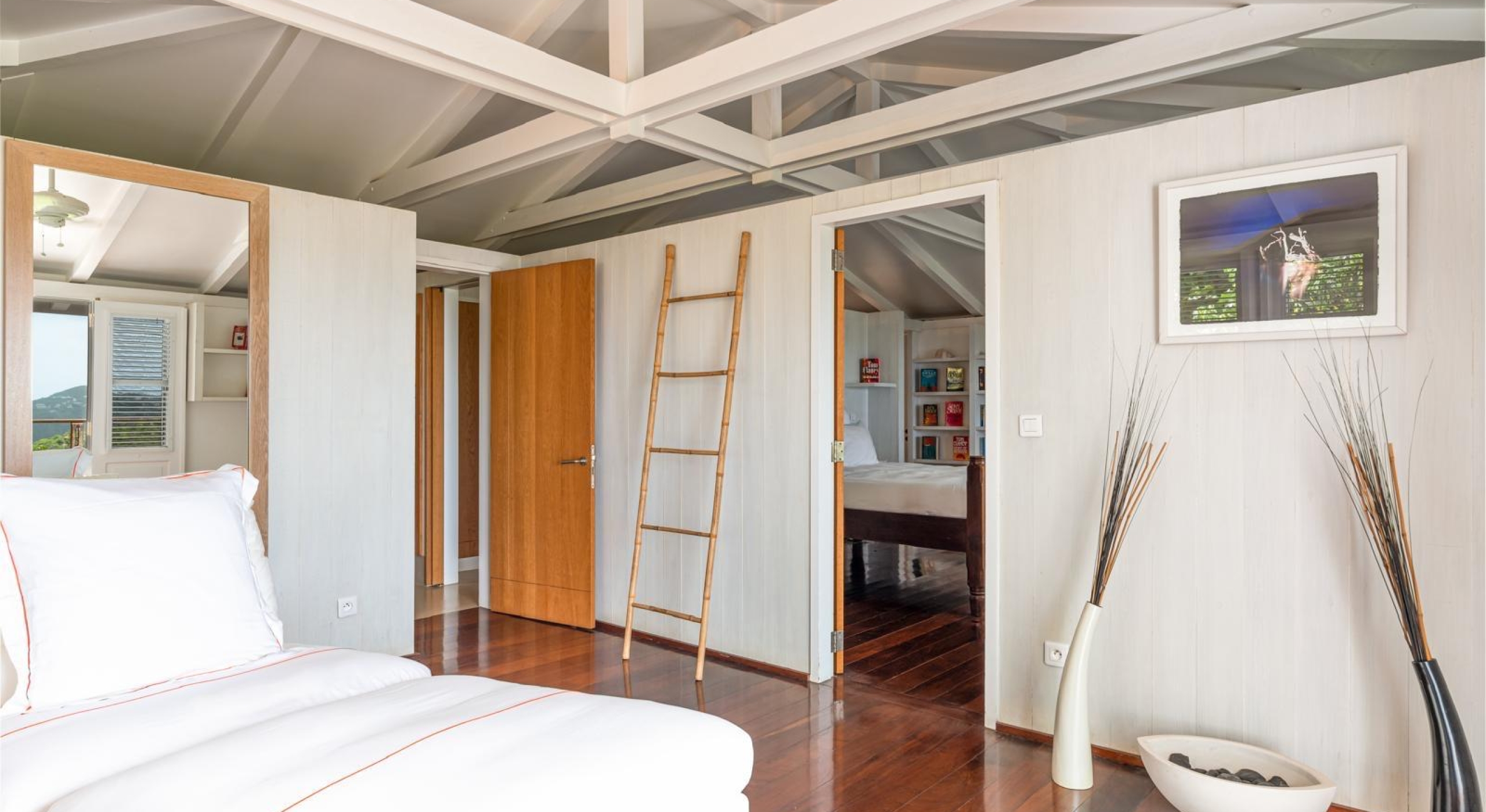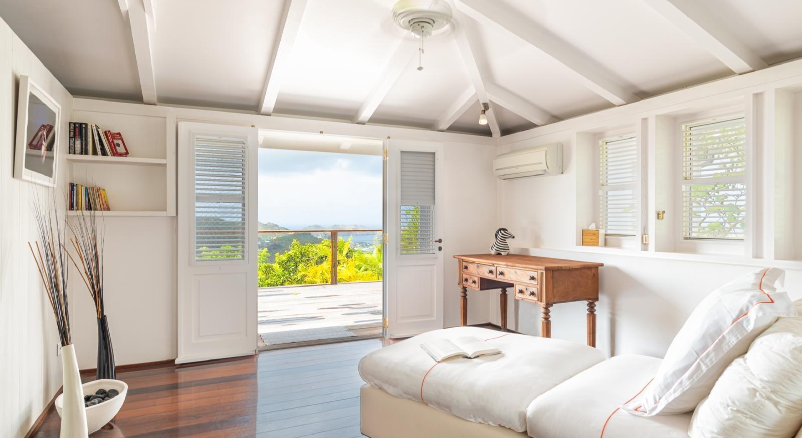 From the living you access the master bedroom on the first floor. Spacious, it opens onto a balcony overlooking the tropical garden and the ocean.