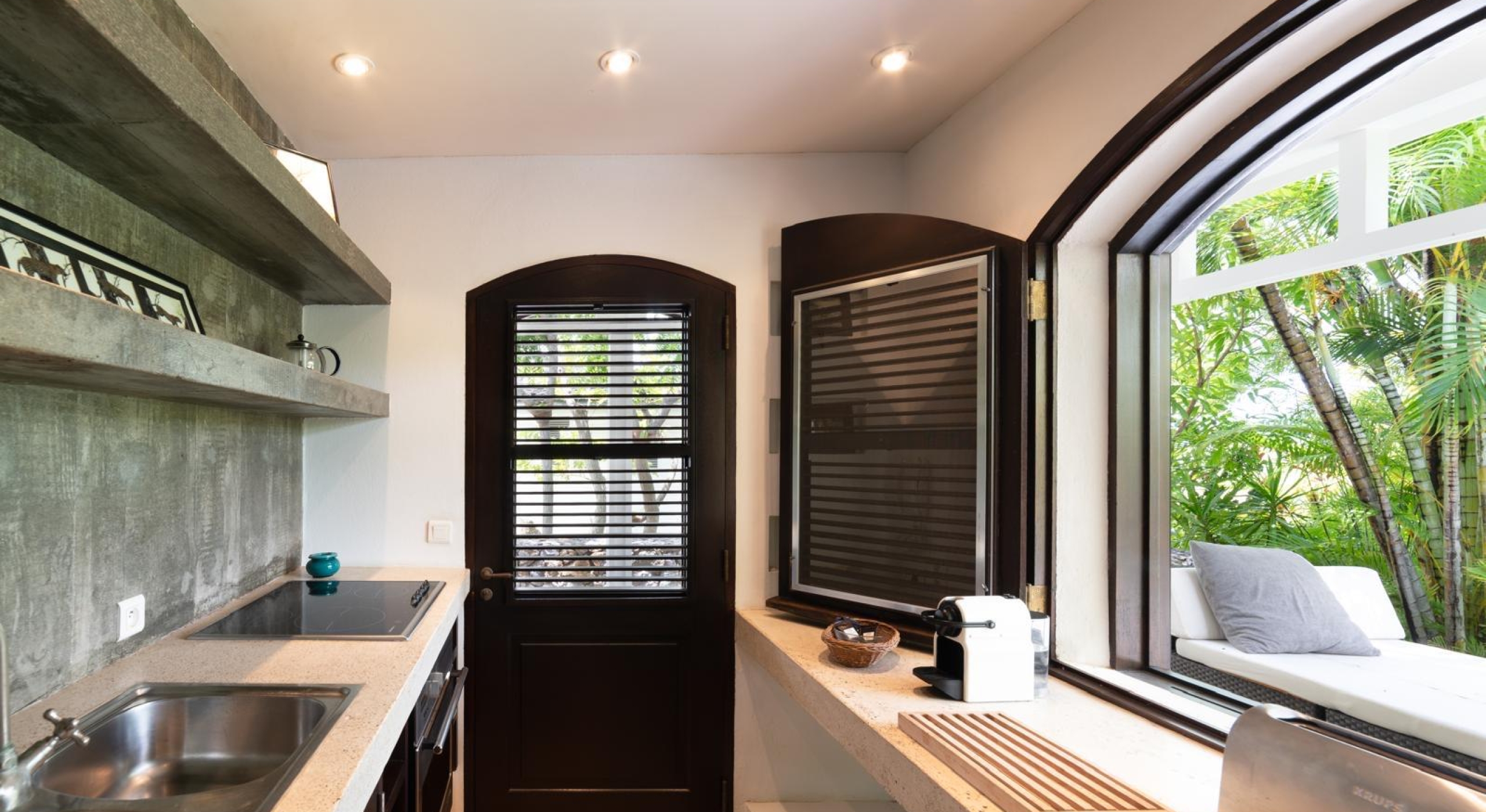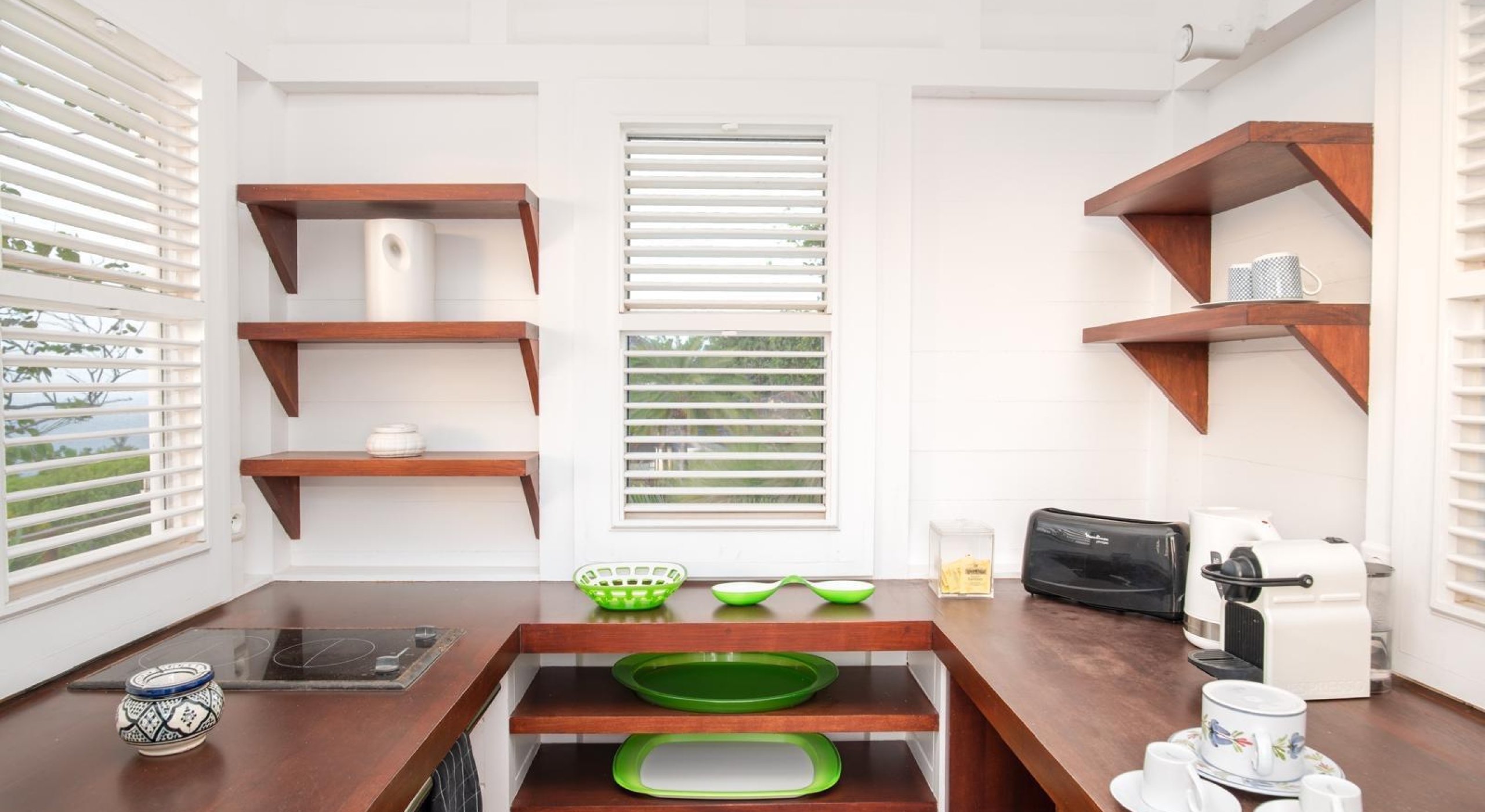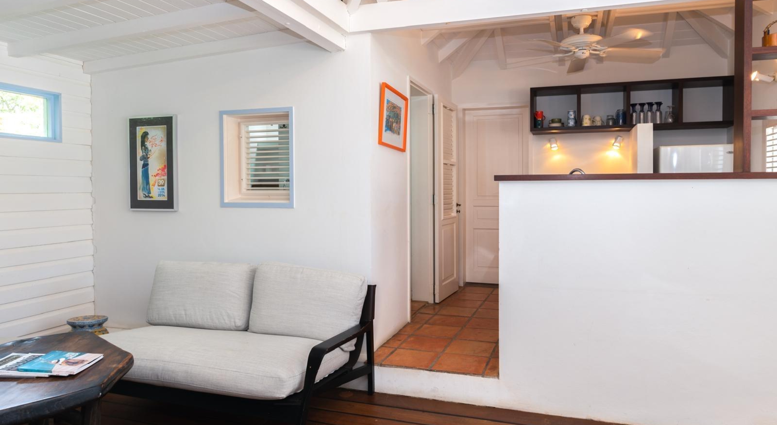 It is a small house surrounded by the lush garden. It offers a large bedroom with two queen size canopy beds, a small kitchen, a bathroom and a terrace.