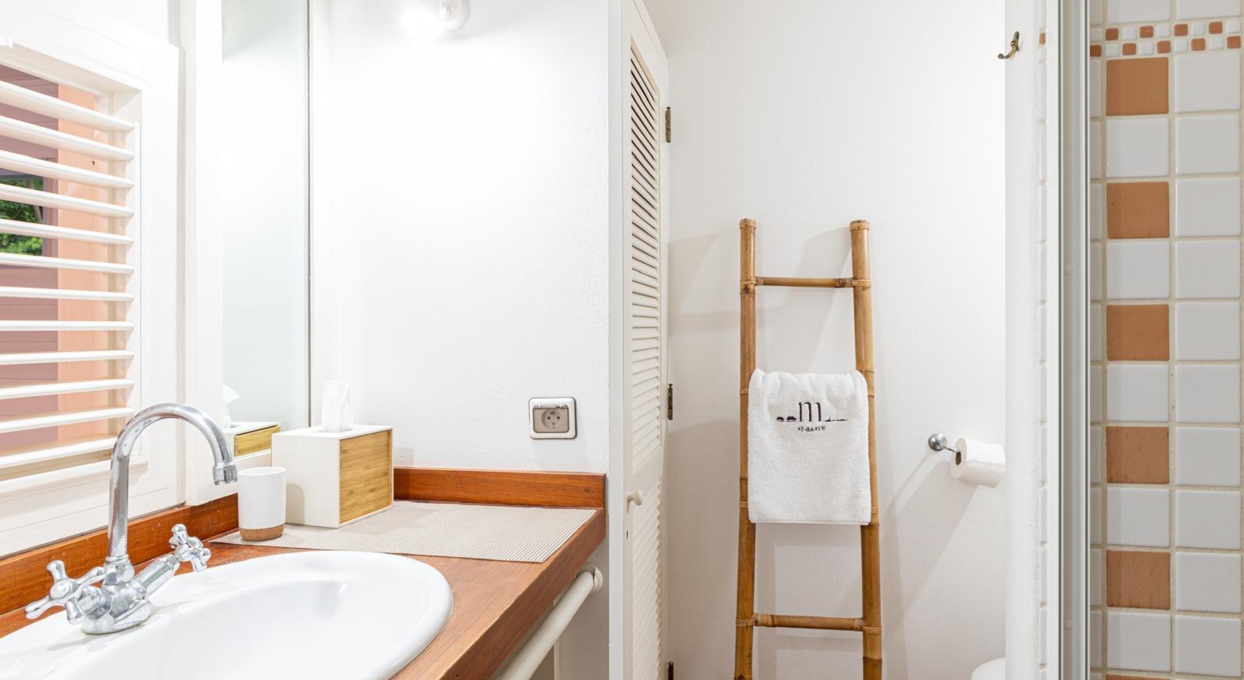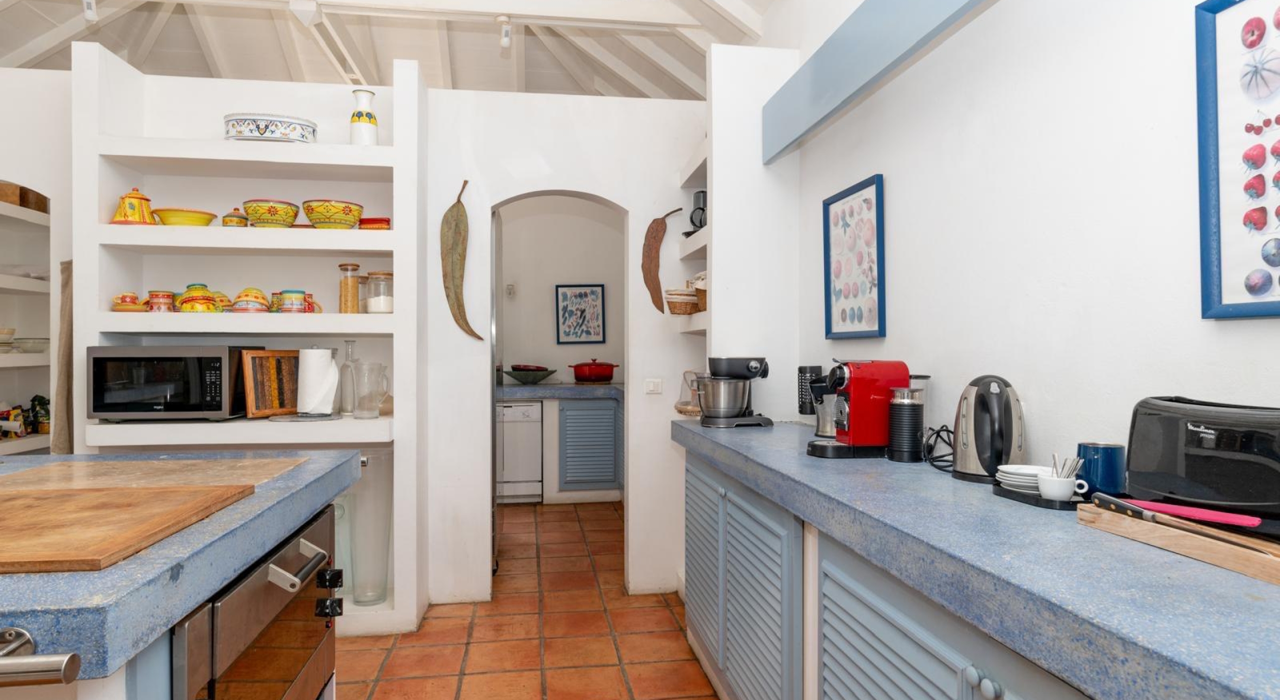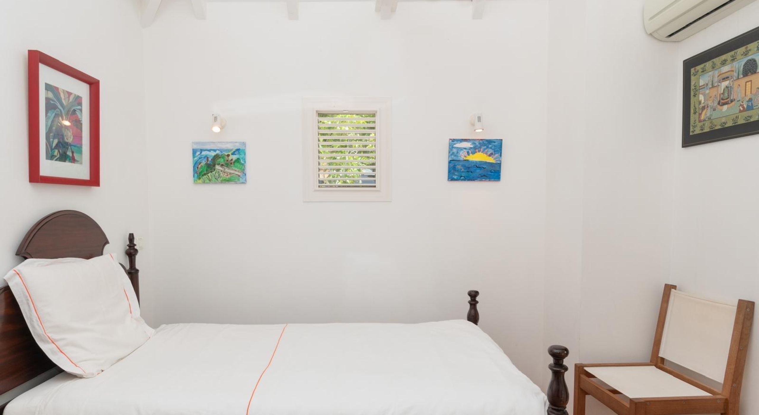 It is a small house surrounded by the lush garden. It offers a large bedroom with two queen size canopy beds, a small kitchen, a bathroom and a terrace.