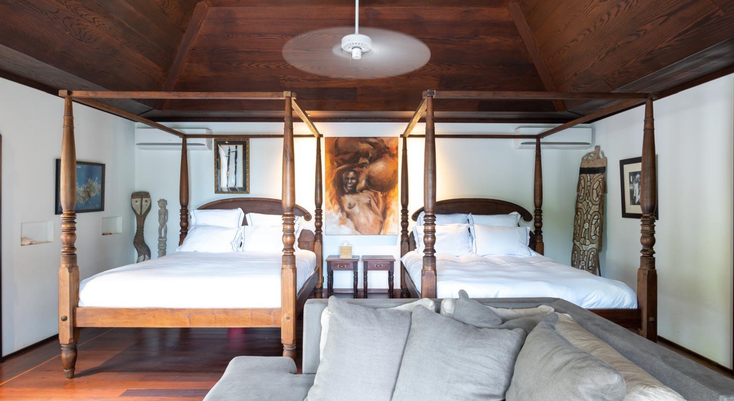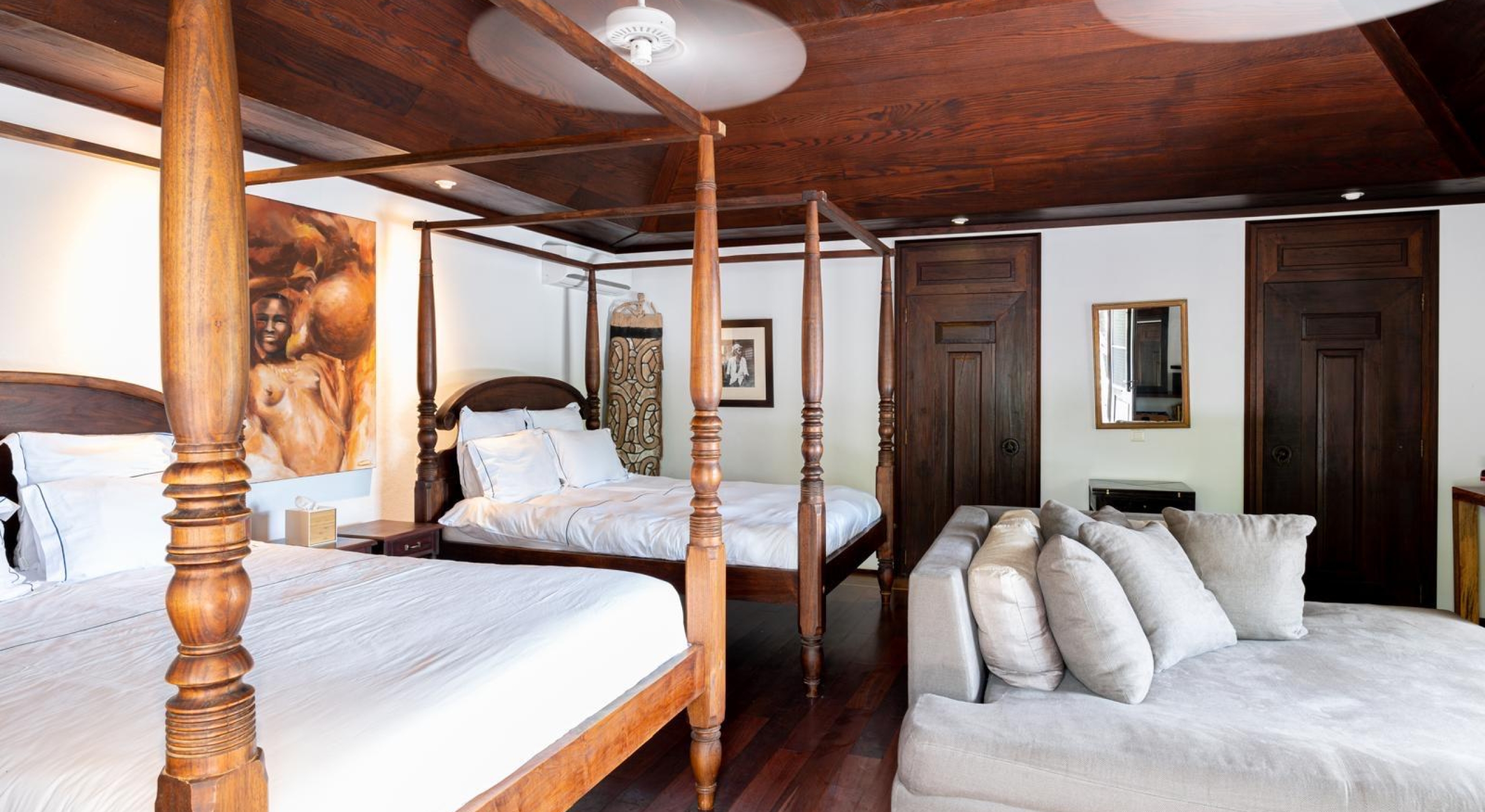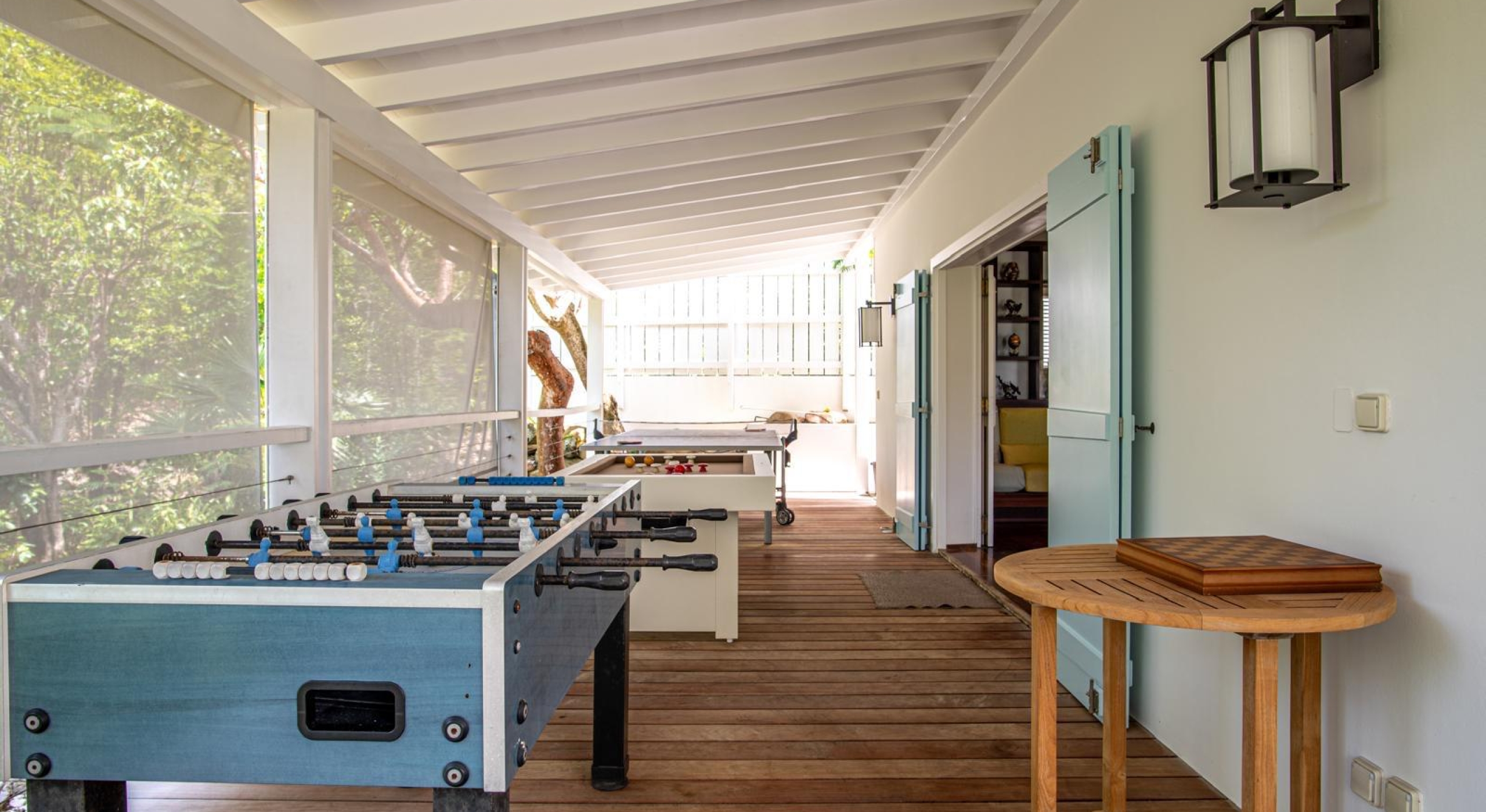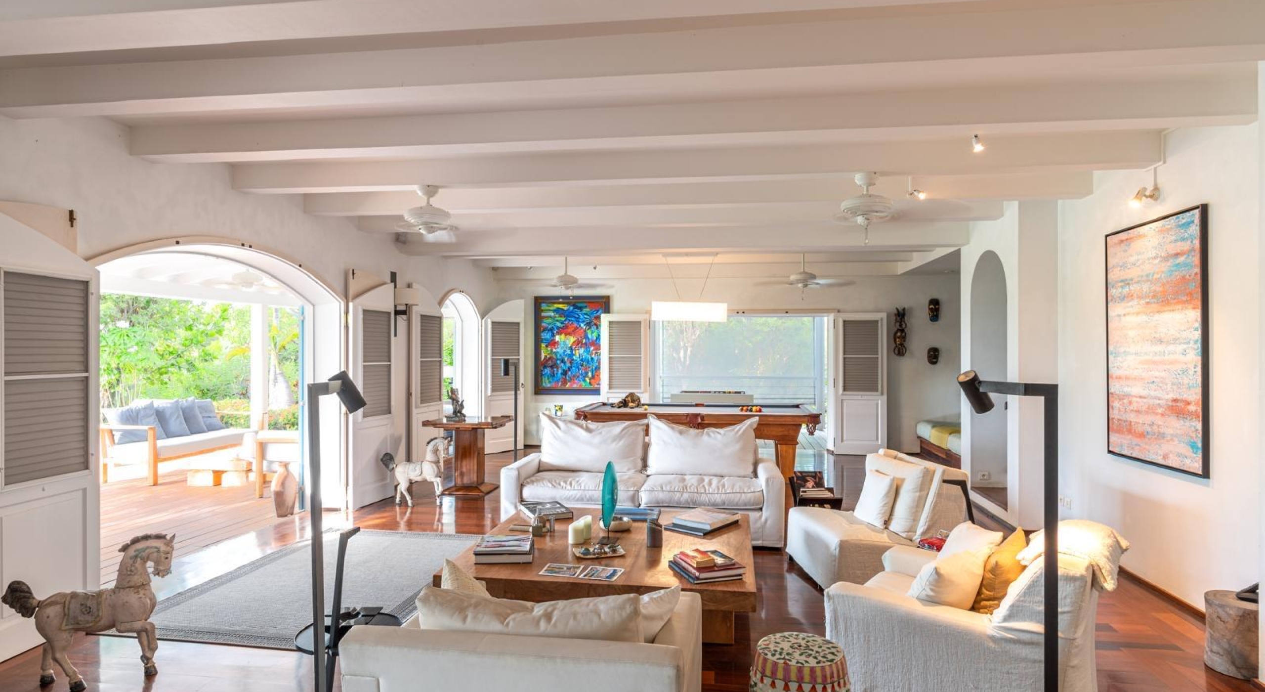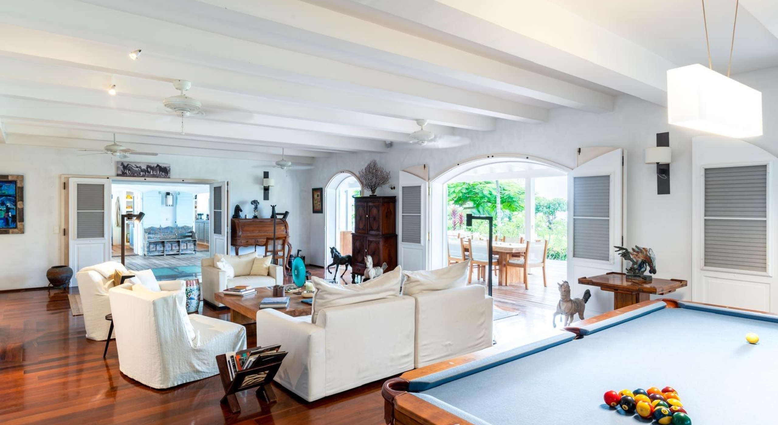 The main house as all the colonial homes opens onto a covered terrace with large sofas. The outside decks and inside parquet floors are made of exotic woods. On the main floor you will find a large living with a billiard table, a tv room, a kitchen and an outside dining area.