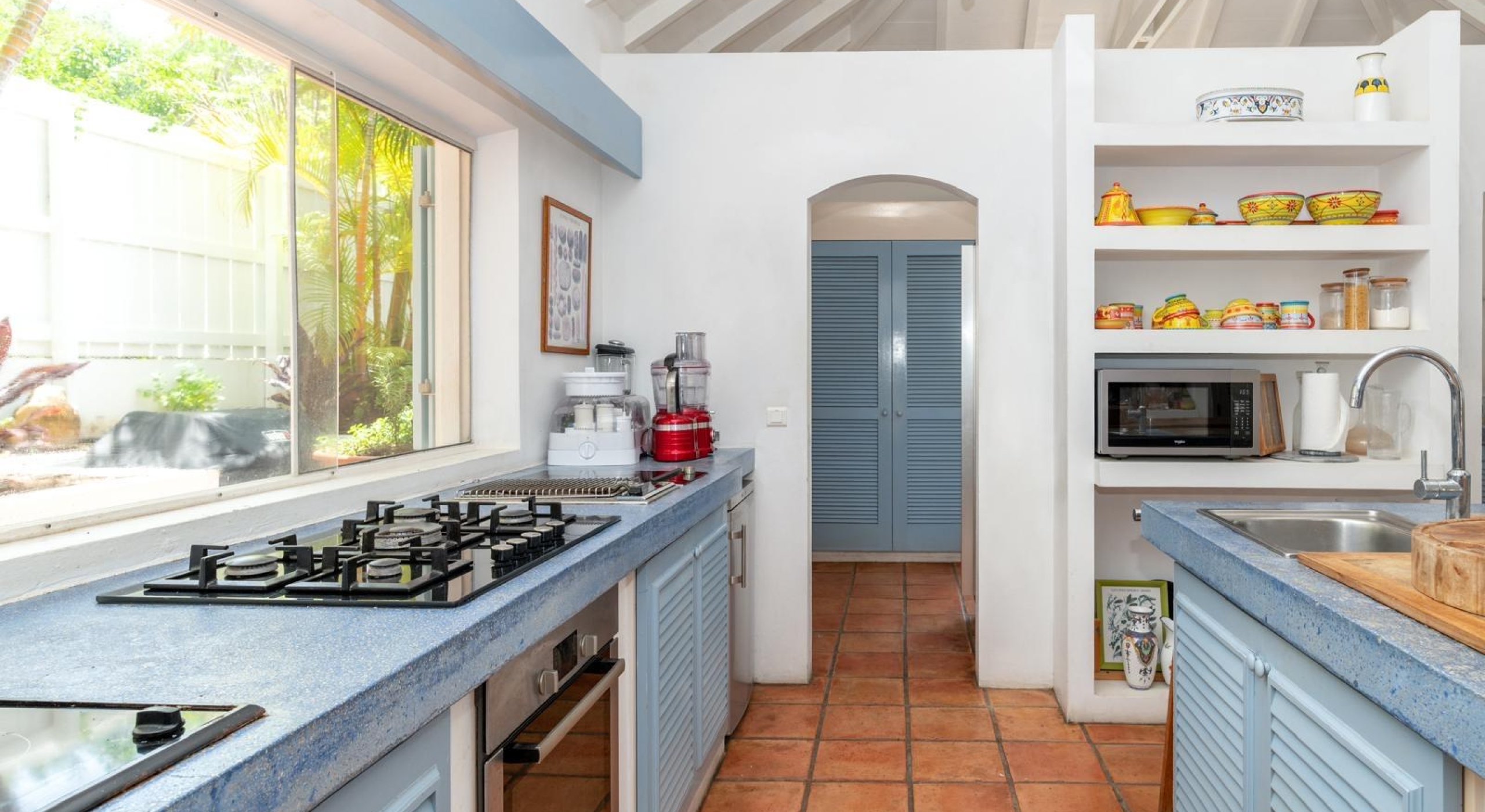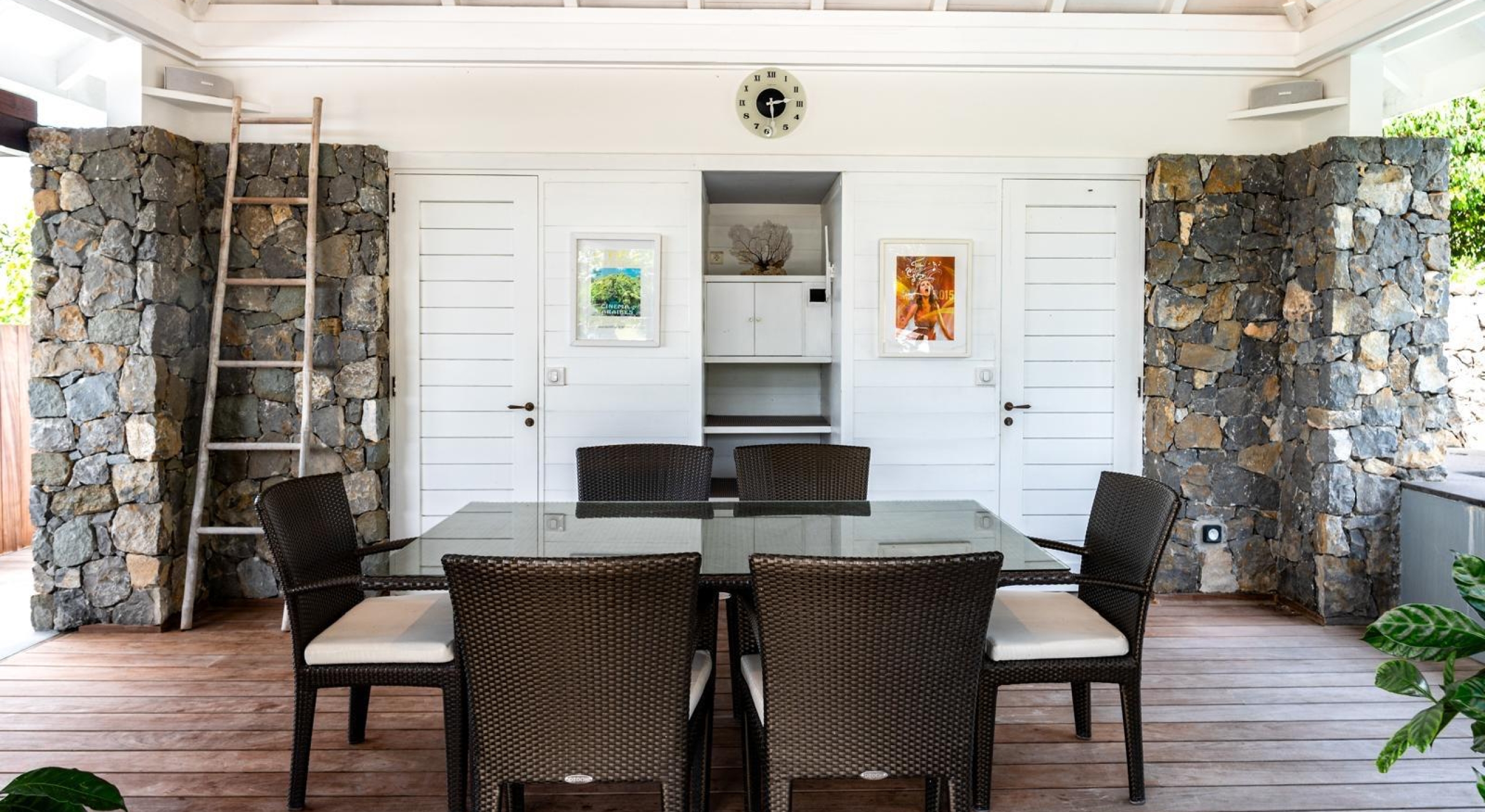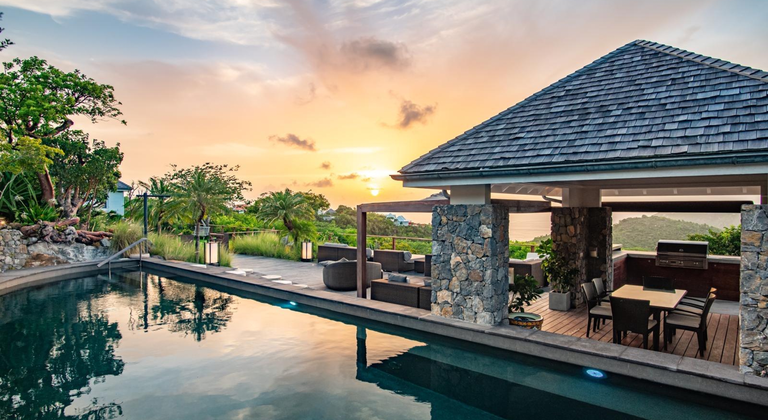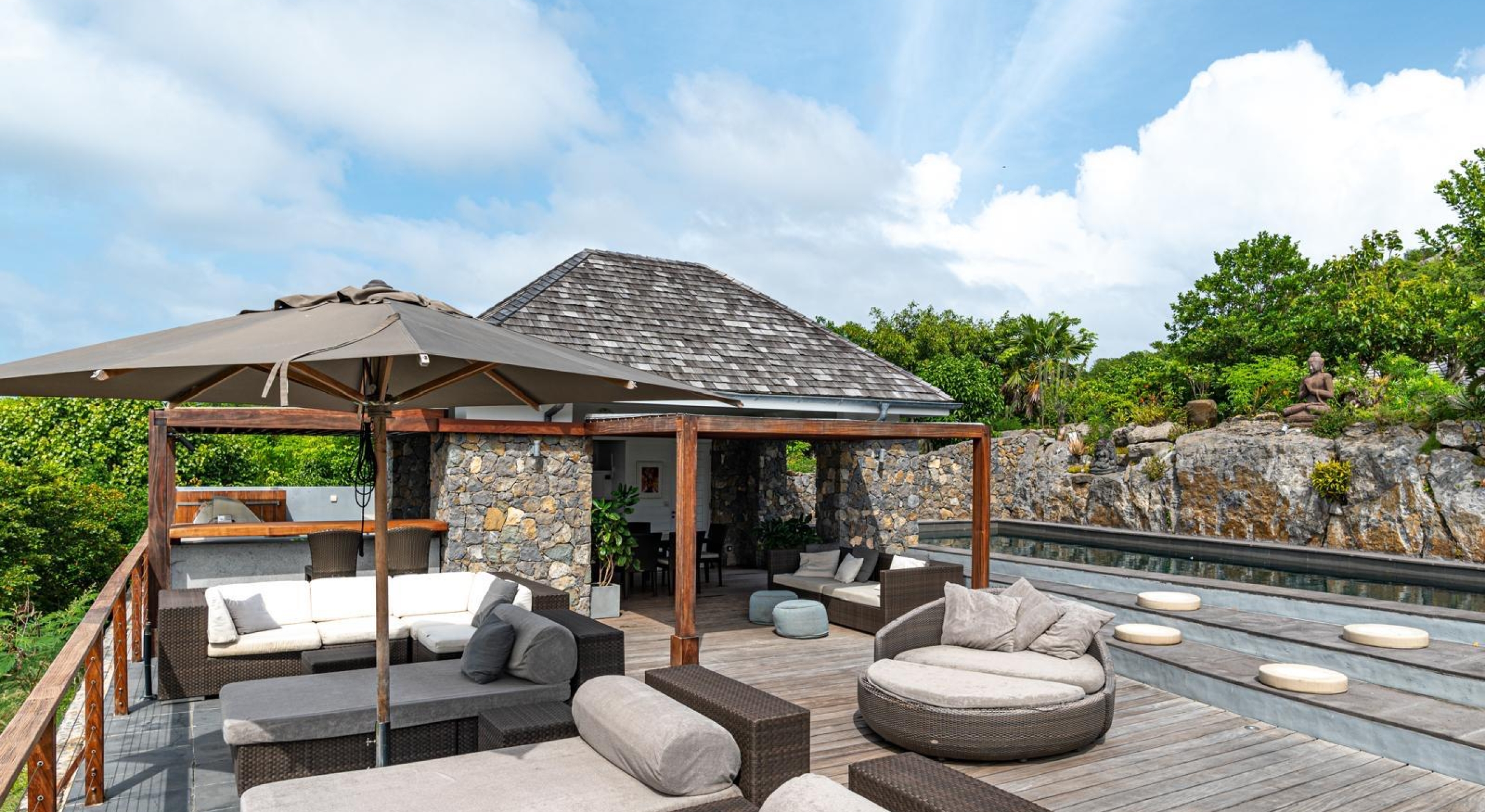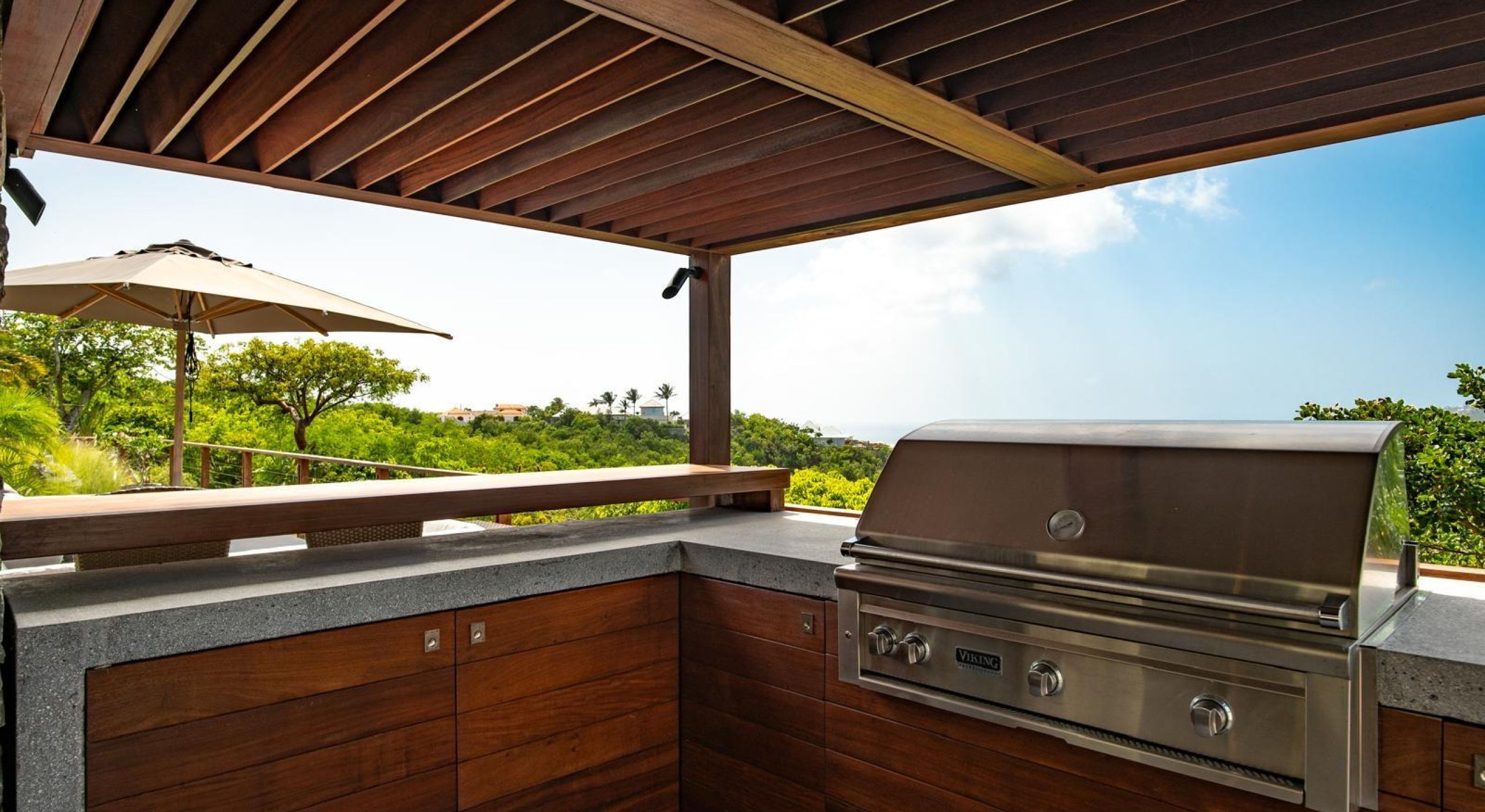 The gazebo opens onto an outside dining area and a small kitchen with barbecue.